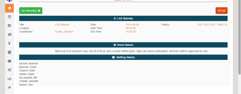 Event creators can assign fleet vehicles to events. This action will automatically create a reservation in the system. As a result, on the Vehicle Monitor the vehicles will note the next upcoming event specific to that fleet vehicle and the date/time so that you can avoid double booking apparatus. Additionally, the utilization will be logged into the apparatus history for accountability and usage analytics.