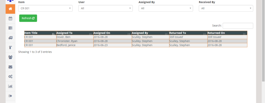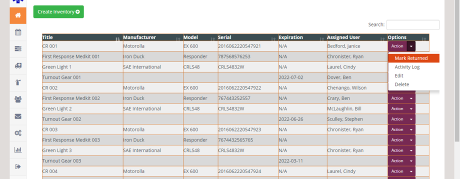 Inventory can be assigned to users and returned to the stock on the panel. All transactions are logged for accountability. Additionally, a user’s assigned inventory displays on his or her user dashboard for ease of access.
