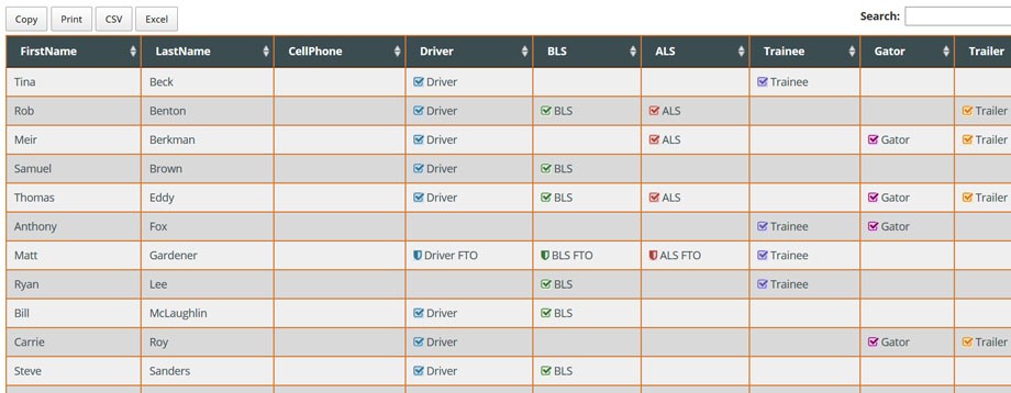 The Credential Roster is alphabetically ordered and displays the user’s name, credentials, email, phone, and FTO credentials. The User Role listing is a more compact list in spreadsheet format that displays the same information in a sortable and exportable fashion for reference.