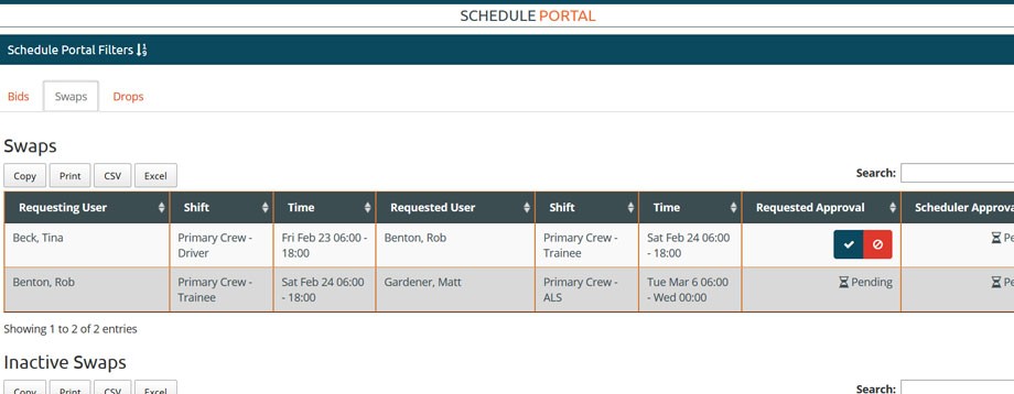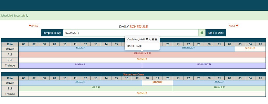 Users can only sign up or bid for shifts that correspond with their roles. For example, a user who is listed only as an EMT cannot sign up for a shift slot delineated as a Medic Shift. In extenuating circumstances, however, an administrator can assign anyone to a shift regardless of general restrictions.