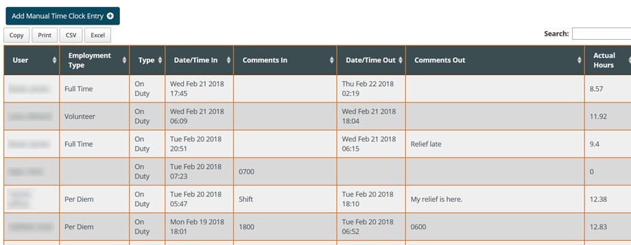 Our Time Clock system allows agencies to track time contributions of volunteer and paid staff alike. Through your administration panel, you can customize different activity categories from which users can select when clocking into the system: IE shift, training, or meetings. Clock-in and Clock-out functionalities can be accessed anywhere or restricted to specific devices, such as the station computer with just a few clicks on your administration panel.