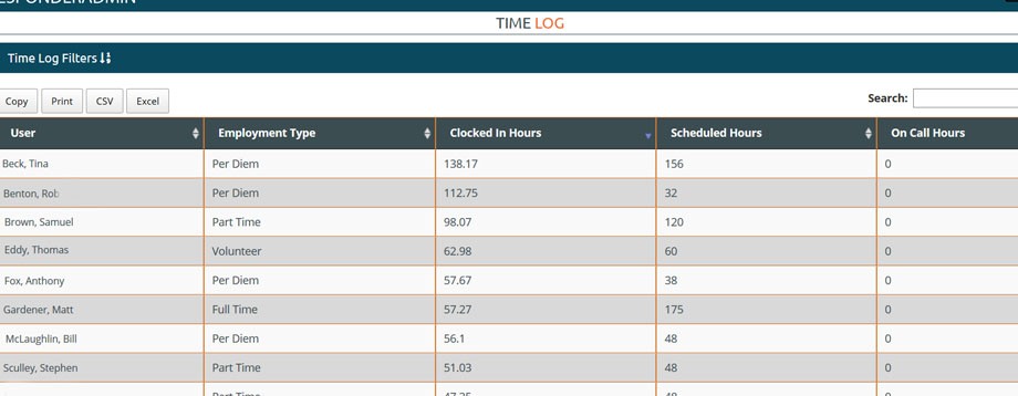 For career/paid agencies, the premier functionality is for payroll. Responder Admin offers a variety of formats to view and export payroll hours that show activity on a daily basis or alternatively an aggregate view of hours per pay period.