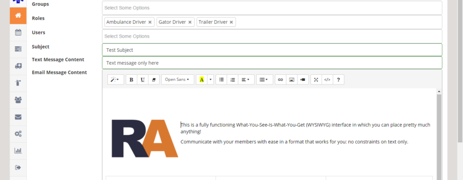 The email feature allows administrators to send messages with any variety of content with very simple editing that mimics your average word processor. You can even include spreadsheets or images in the messages.